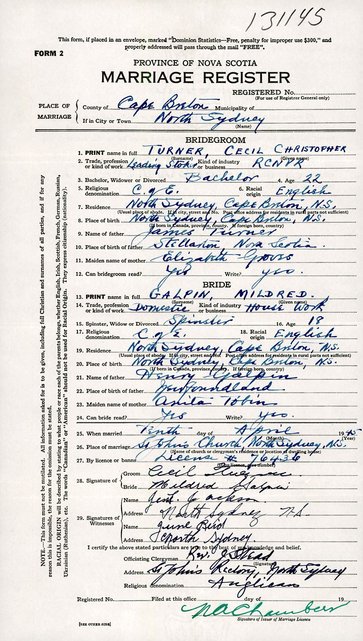 26. Place of marriage St. John's Church North Sydney, Cape Breton County