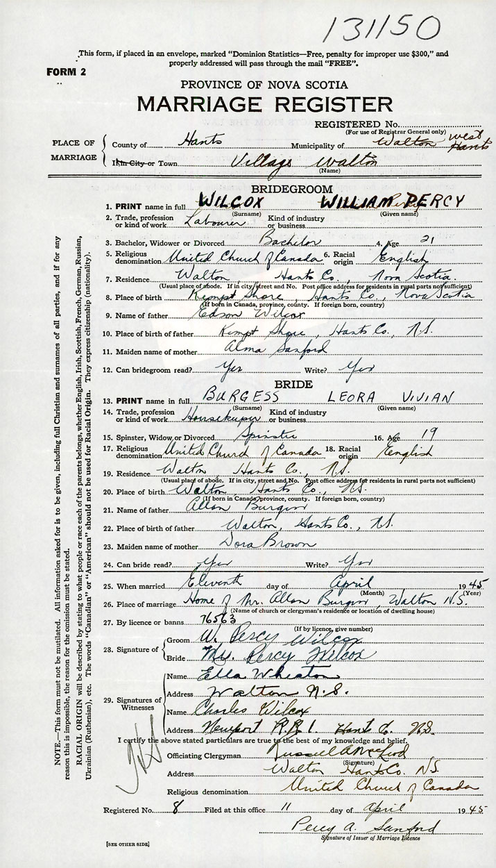 26. Place of marriage Home of mr.Allan Burgess Walton, Hants County