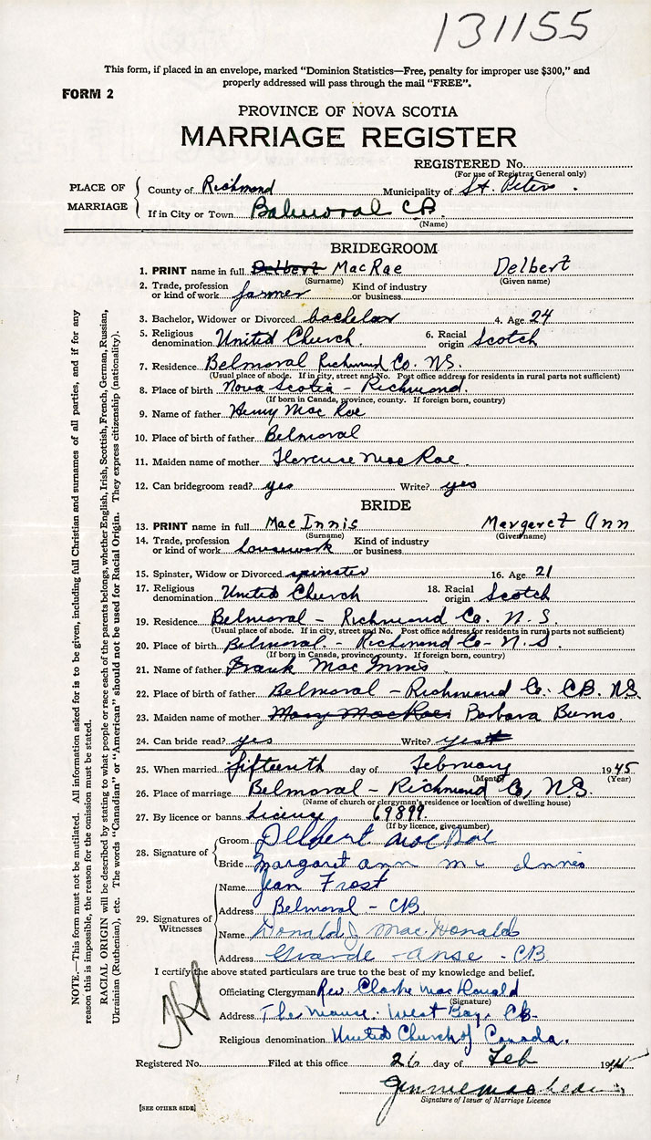 20. Place of birth Balmoral, Richmond, Nova Scotia