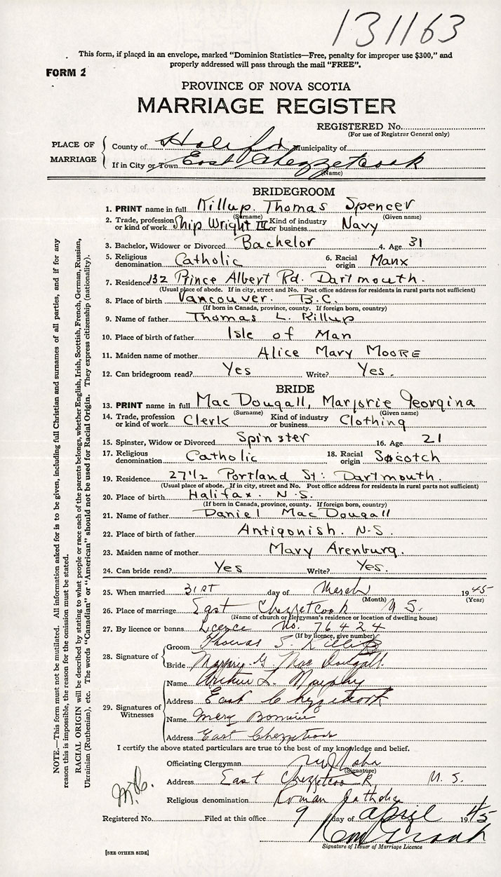 26. Place of marriage East Chezzetcook, Halifax County