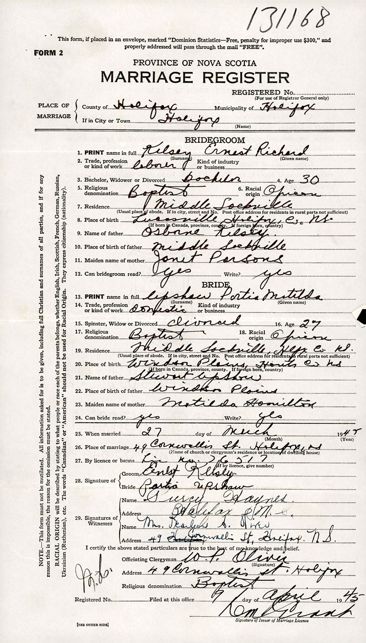 26. Place of marriage 49 Cornwallis Street Halifax, Halifax County
