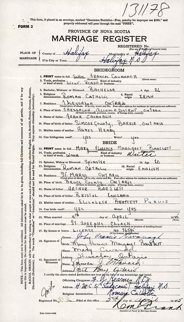 26. Place of marriage St Joseph's Church Halifax, Halifax County