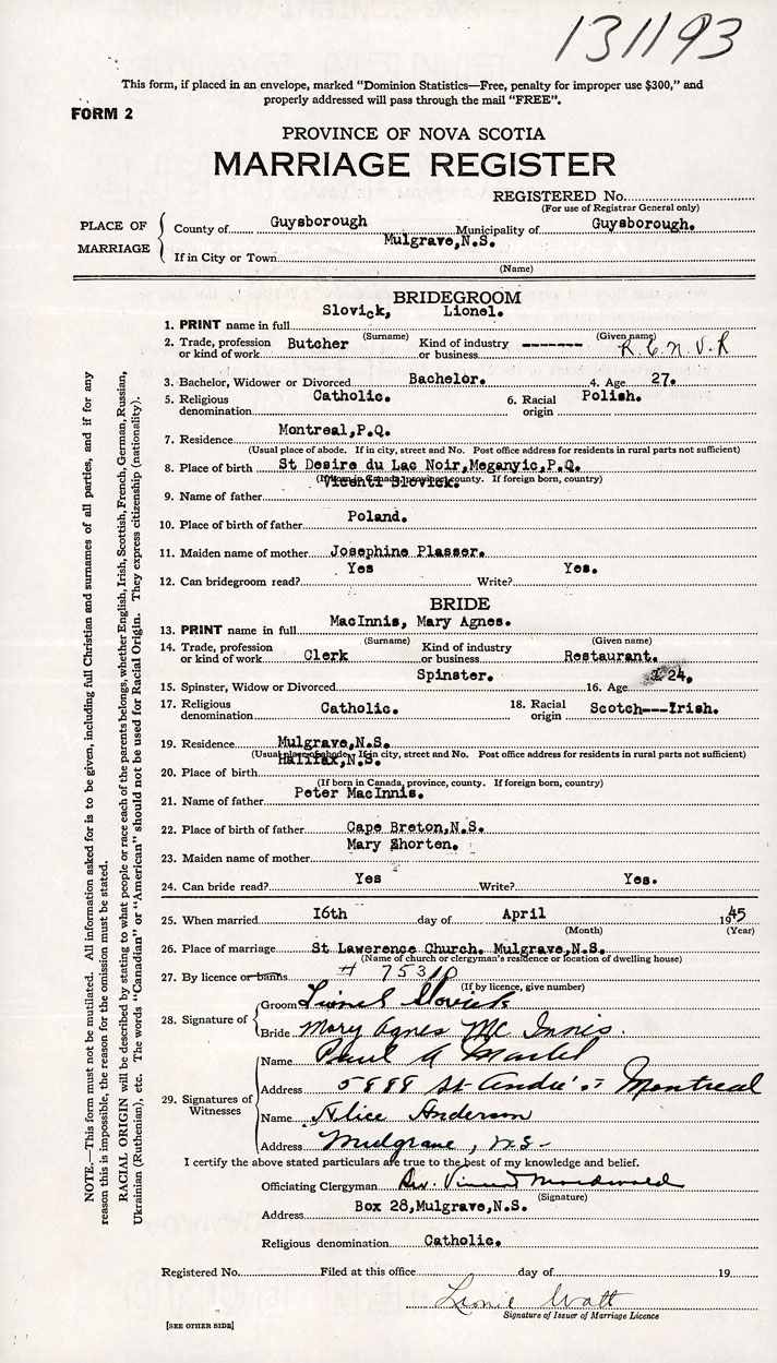 PLACE OF MARRIAGE County of Guysborough in City or Town Mulgrave