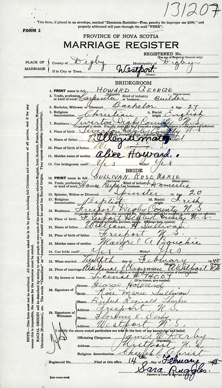 PLACE OF MARRIAGE County of Digby in City or Town Westport