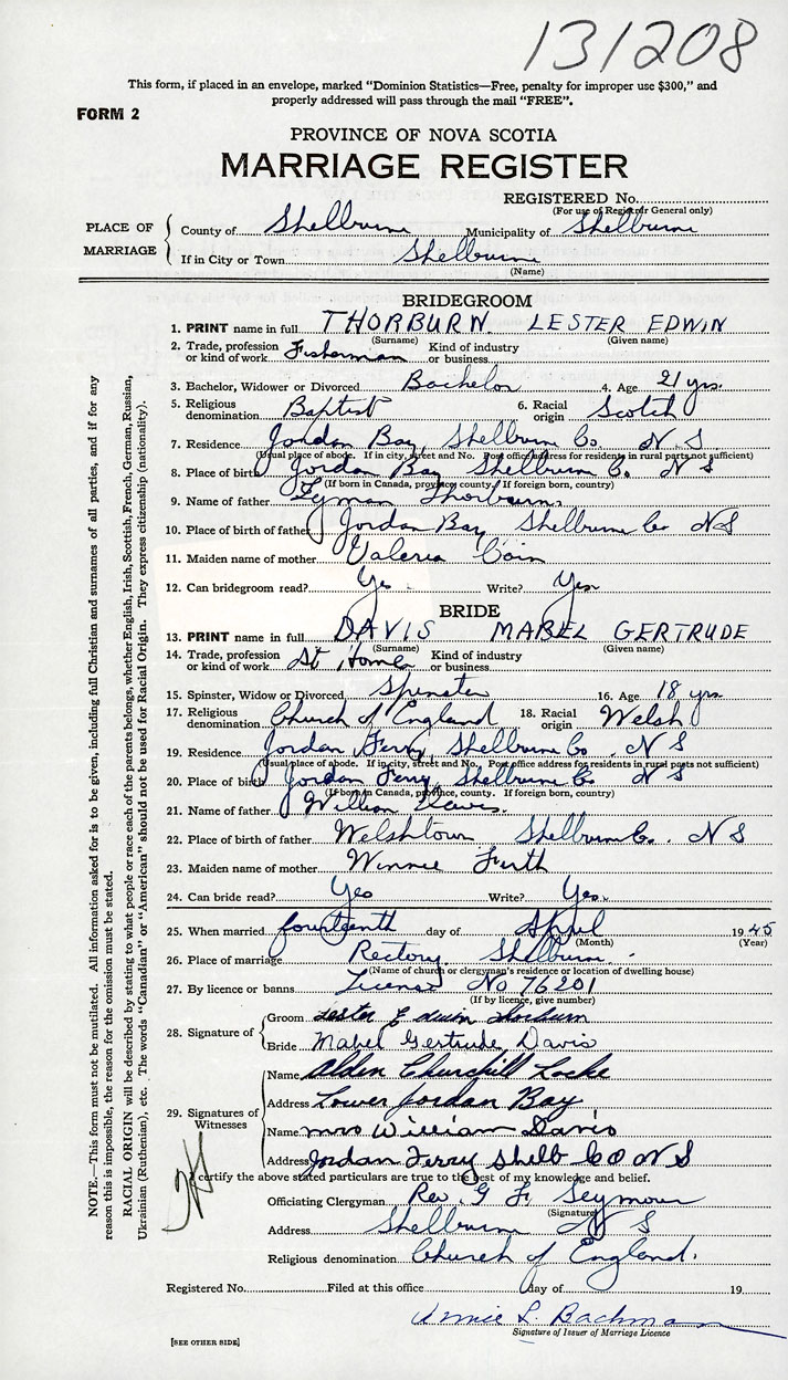 26. Place of marriage Rectory Shelburne, Shelburne County