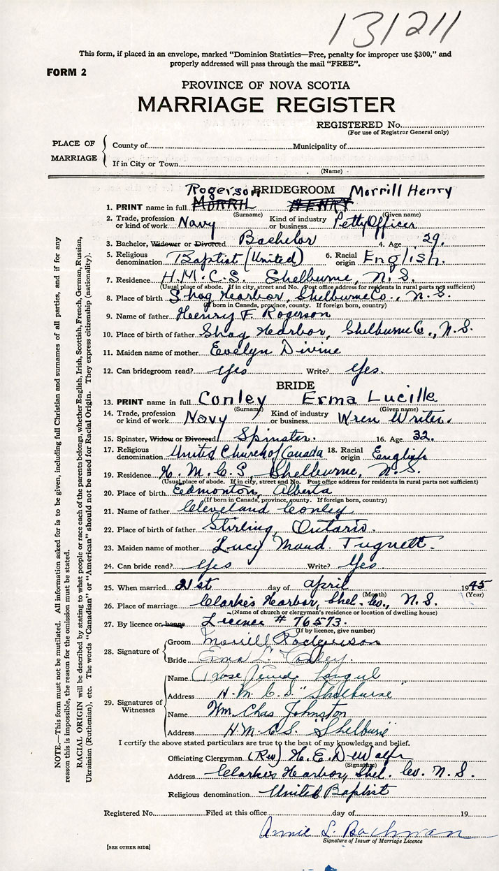 PLACE OF MARRIAGE County of Shelburne in City or Town Clark's Harbour