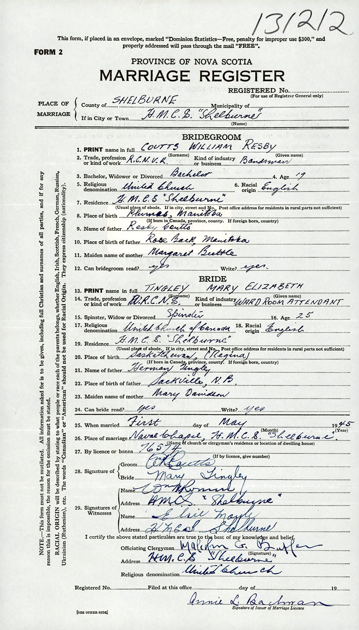 26. Place of marriage Naval Chapel, HMCS Shelburne Shelburne, Shelburne County