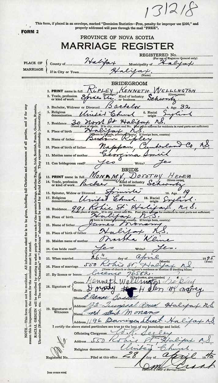 26. Place of marriage 500 Robie St Halifax, Halifax County