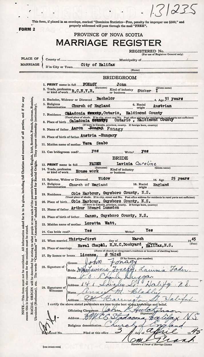 According to a certified copy of the Decree Absolute for Divorce dated 1956-3-23 and filed in the Office of the Registrar General under Divorce number 1104, it is ordered that the marriage of John Fonagy and Lavinia Caroline Fader (Registered under marriage number 1945-131235) be null and void.