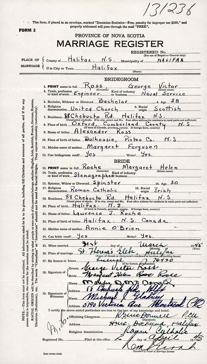 26. Place of marriage St. Theresa's Glebe Halifax, Halifax County