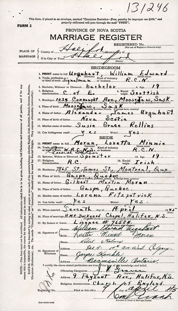 26. Place of marriage H.M.C. Dockyard Chapel Halifax, Halifax County