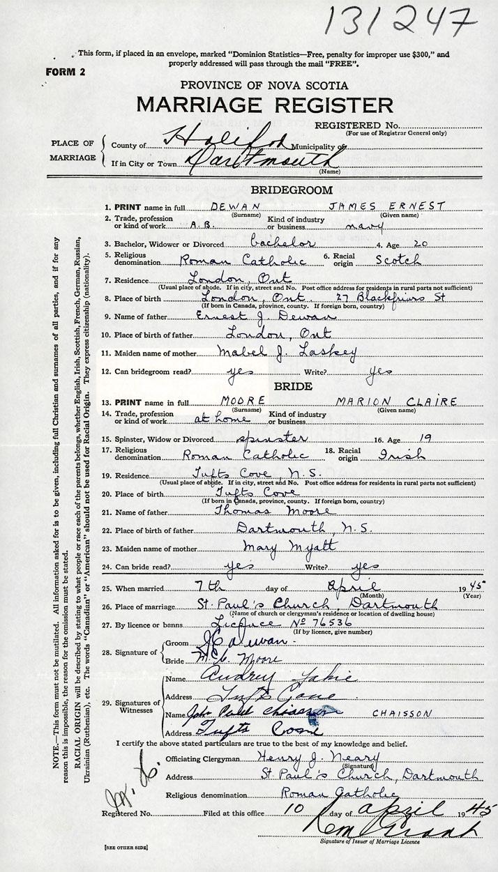 PLACE OF MARRIAGE County of Halifax in City or Town Dartmouth