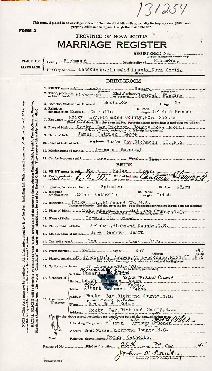 20. Place of birth Rocky Bay, Richmond Co., N.S.