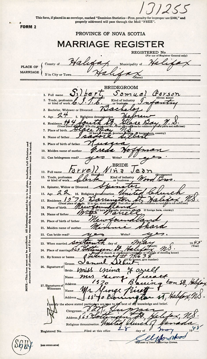 26. Place of marriage 565 Gottingen Street Halifax, Halifax County
