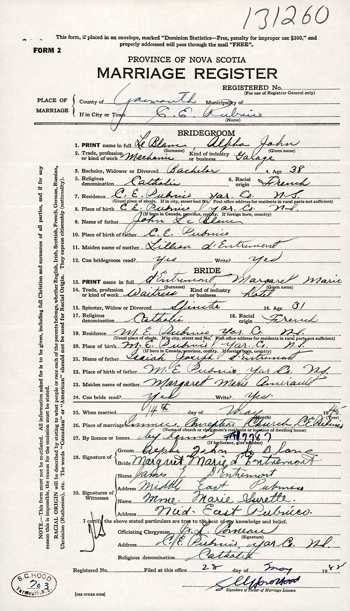 26. Place of marriage Immaculate Conception church Centre East Pubnico, Yarmouth County, Nova Scotia, Yarmouth County
