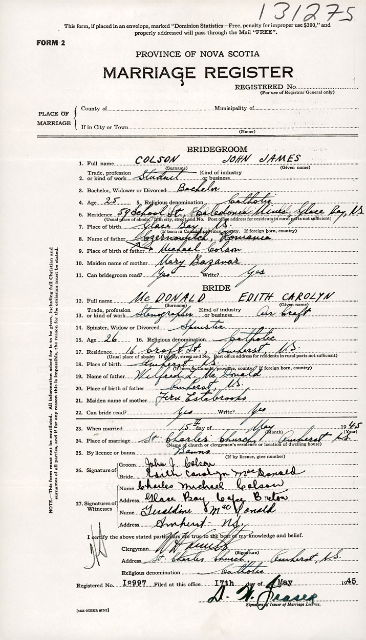 26. Place of marriage Amherst, Cumberland County