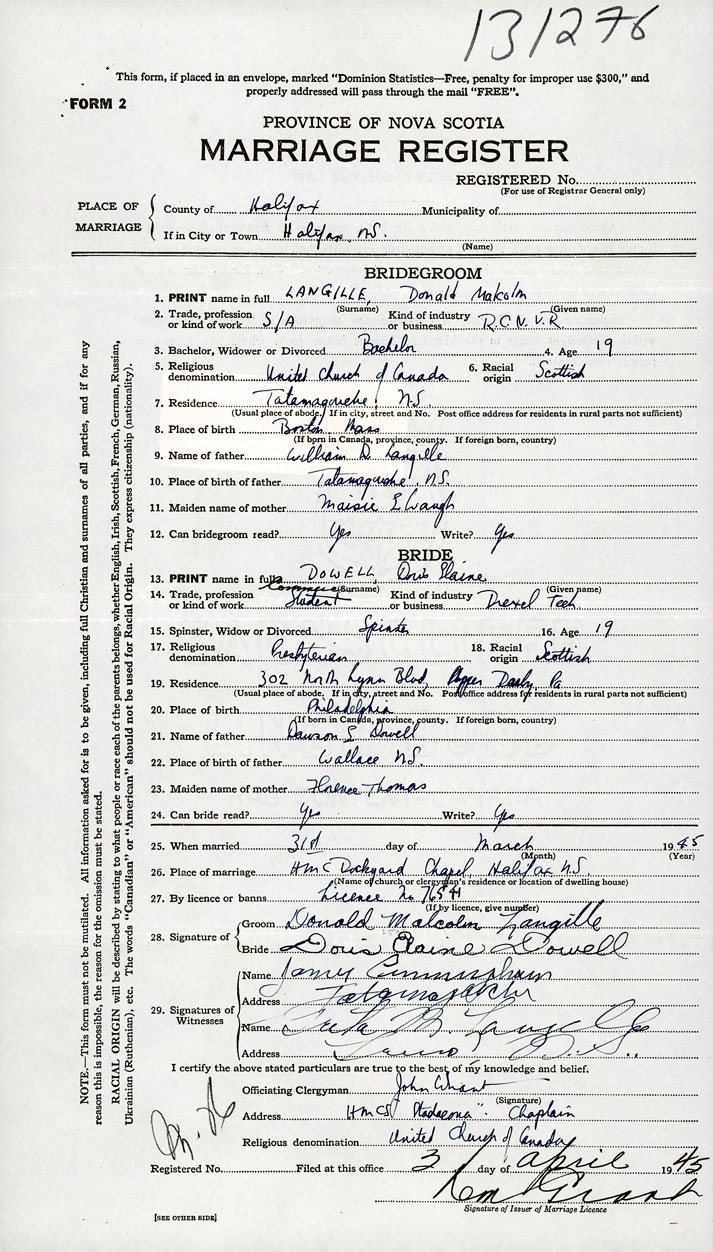 Groom Donald Malcolm Langille
