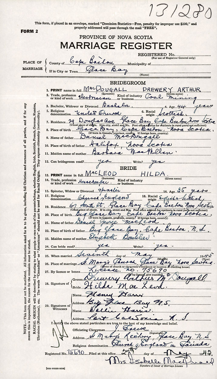 26. Place of marriage Glace Bay, Cape Breton County
