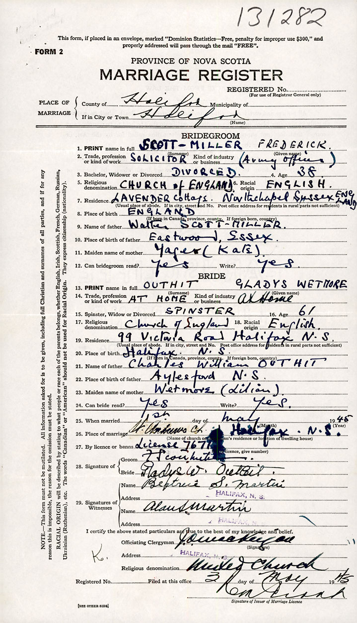 PLACE OF MARRIAGE County of Halifax in City or Town Halifax