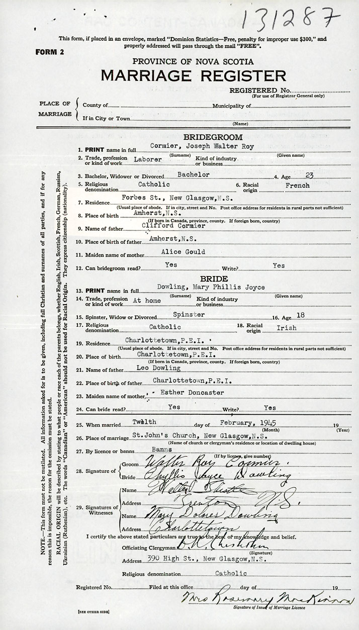 According to a certified copy of the Decree Absolute for Divorce dated 1957-9-13 and filed in the Office of the Registrar General under Divorce number 1556, it is ordered that the marriage of Joseph Walter Roy Cormier and Mary Phyllis Joyce Dowling (Registered under marriage number 1945-131287) be null and void.