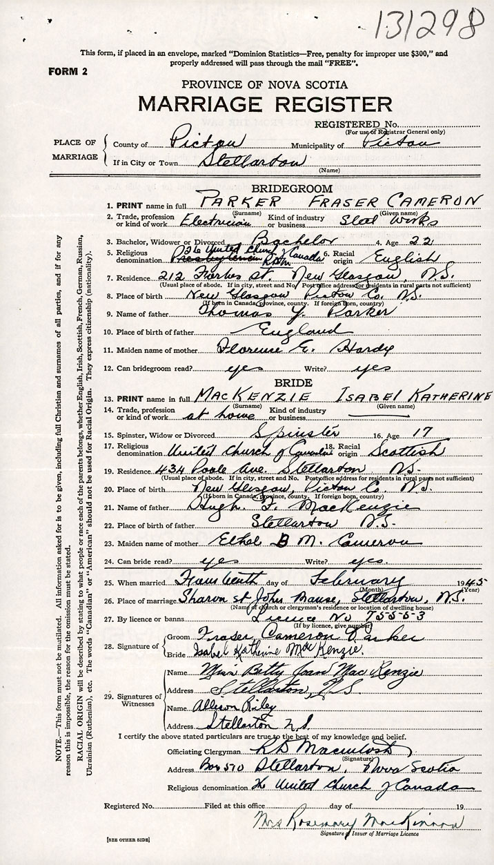 26. Place of marriage Sharon St. John Manse Stellarton, Pictou County