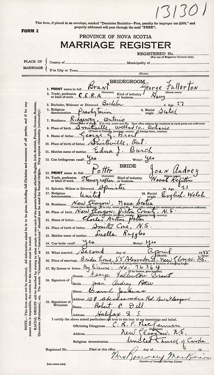 26. Place of marriage 55 Alexander St. New Glasgow, Pictou County