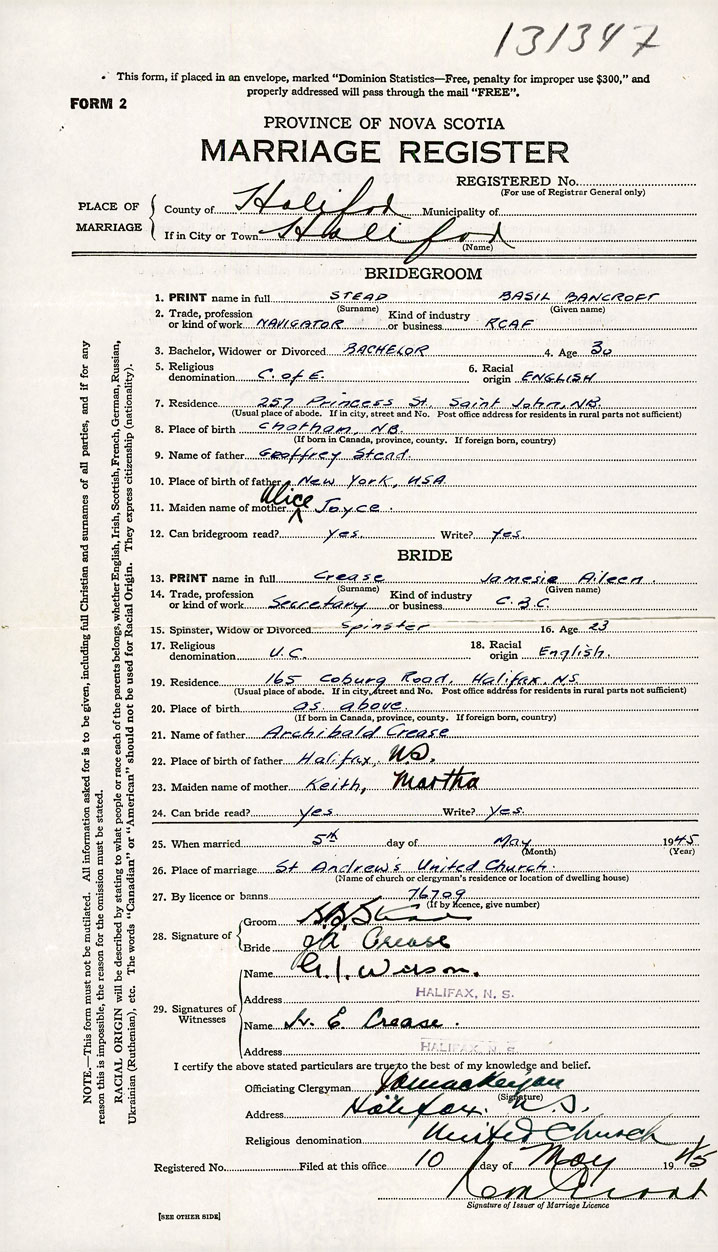 26. Place of marriage St. Andrew's United Church Halifax, Halifax County
