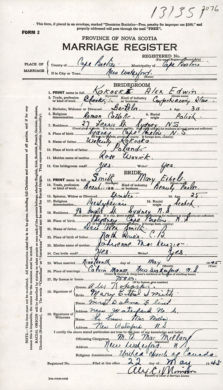 26. Place of marriage Calvin Manse New Waterford, Cape Breton County