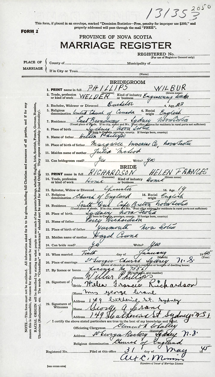 26. Place of marriage St. George's Church Sydney, Cape Breton County