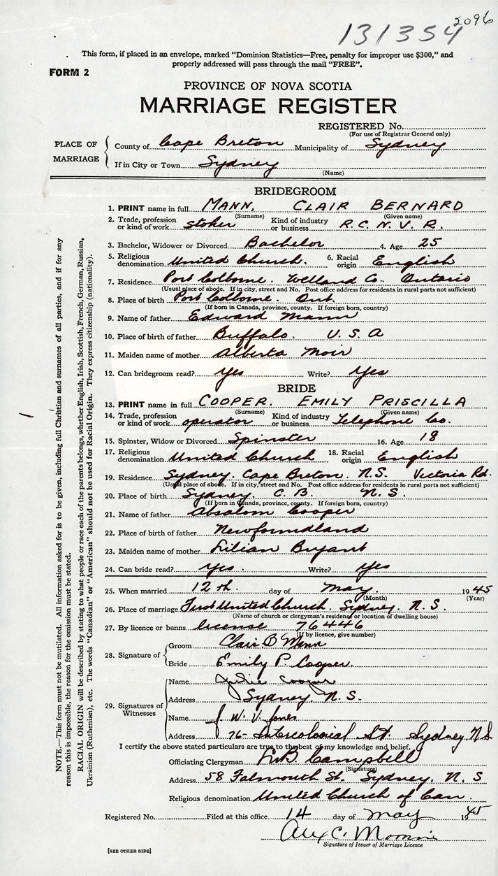 26. Place of marriage First United Church Sydney, Cape Breton County