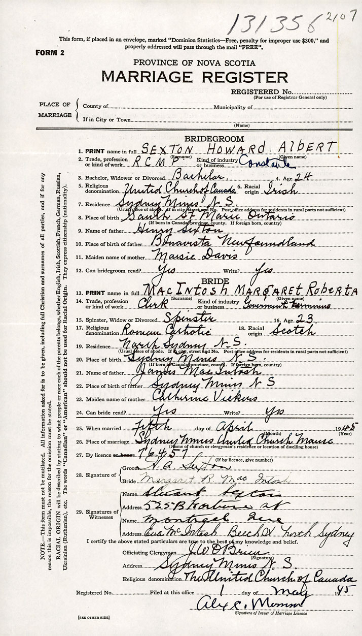 PLACE OF MARRIAGE County of Cape Breton in City or Town Sydney Mines