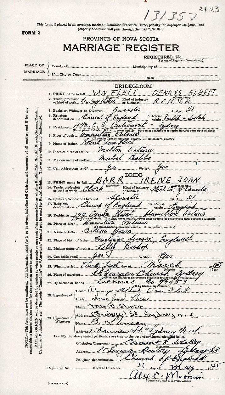 PLACE OF MARRIAGE County of Cape Breton in City or Town Sydney
