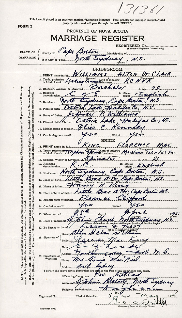 26. Place of marriage St. John's Church North Sydney, Cape Breton County