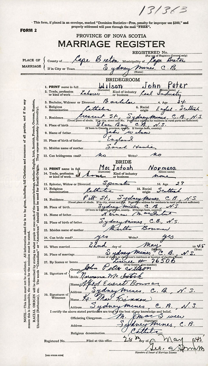 PLACE OF MARRIAGE County of Cape Breton in City or Town Sydney Mines