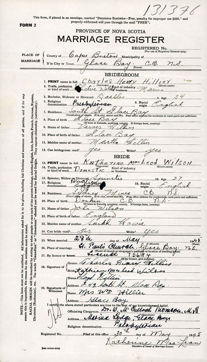 26. Place of marriage St. Paul's Church Glace Bay, Cape Breton County