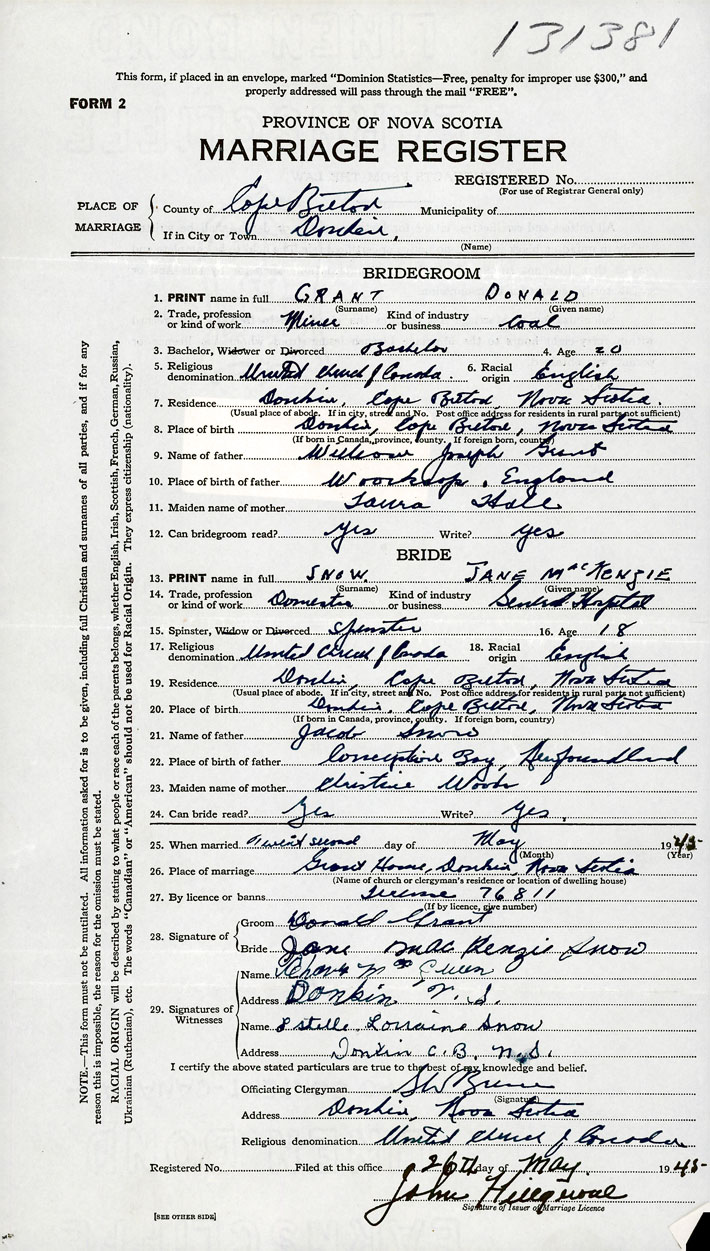 26. Place of marriage Grants Home Donkin, Cape Breton County