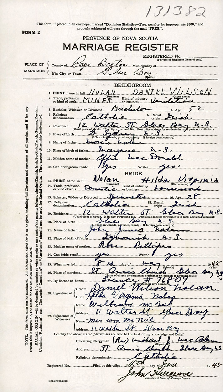 PLACE OF MARRIAGE County of Cape Breton in City or Town Glace Bay