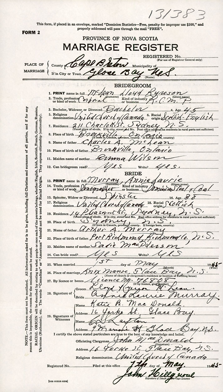 PLACE OF MARRIAGE County of Cape Breton in City or Town Glace Bay