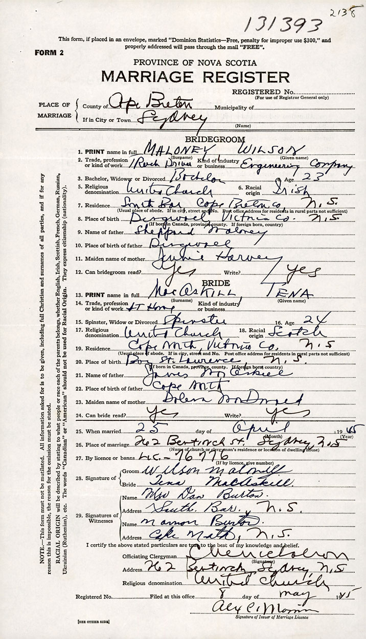 26. Place of marriage 262 Bentinch Sydney, Cape Breton County