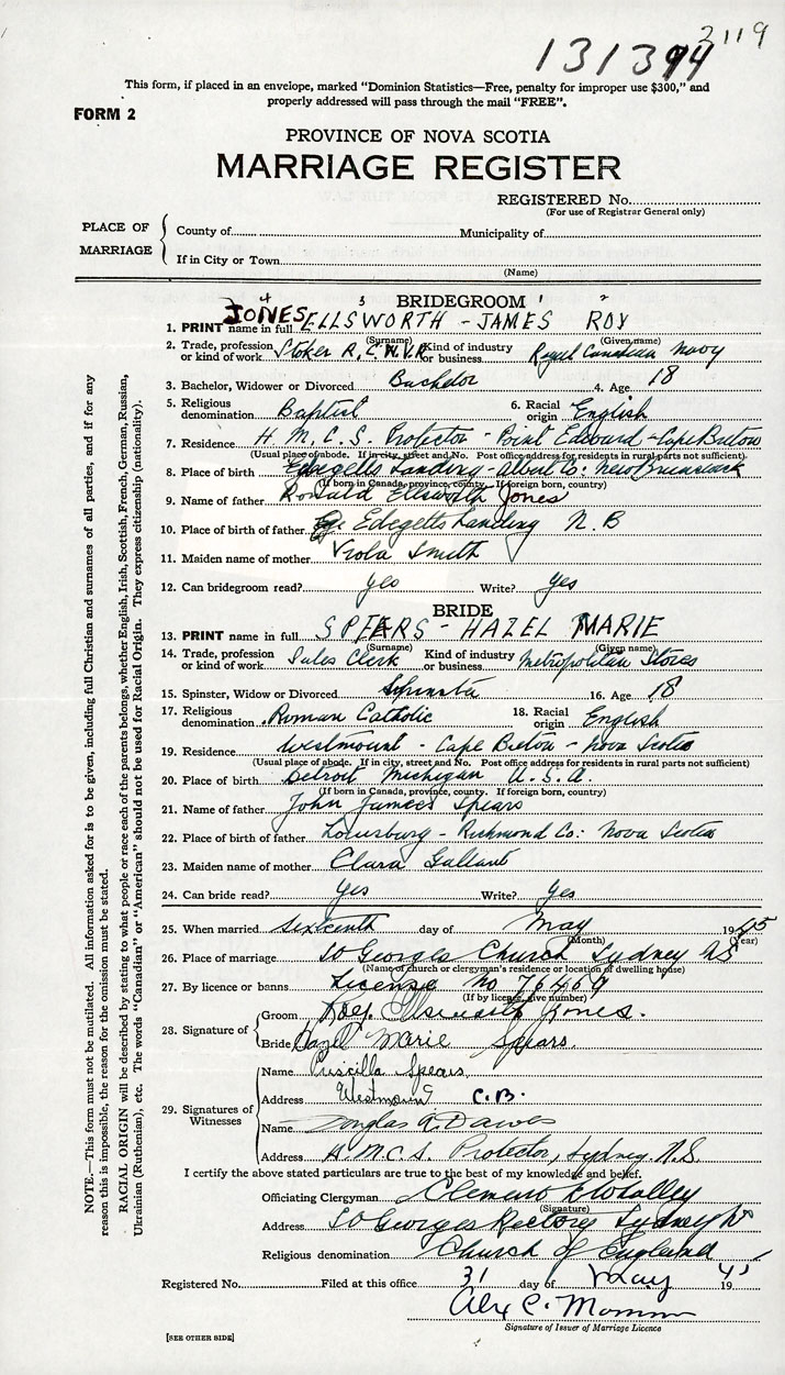 26. Place of marriage St. George’s Church Sydney, Cape Breton County