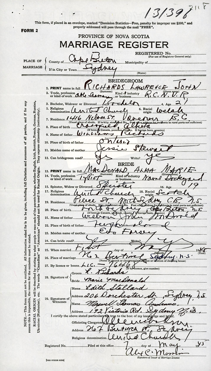 26. Place of marriage 262 Bentinck St. Sydney, Cape Breton County