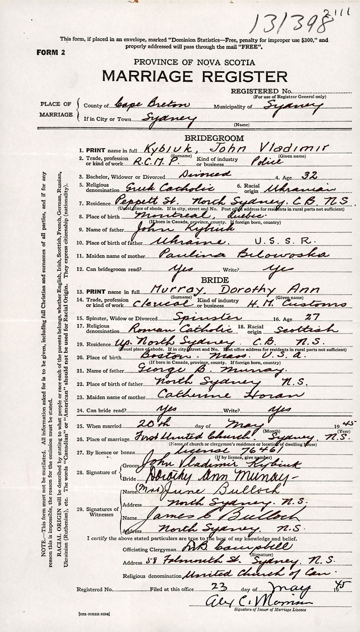 PLACE OF MARRIAGE County of Cape Breton in City or Town Sydney