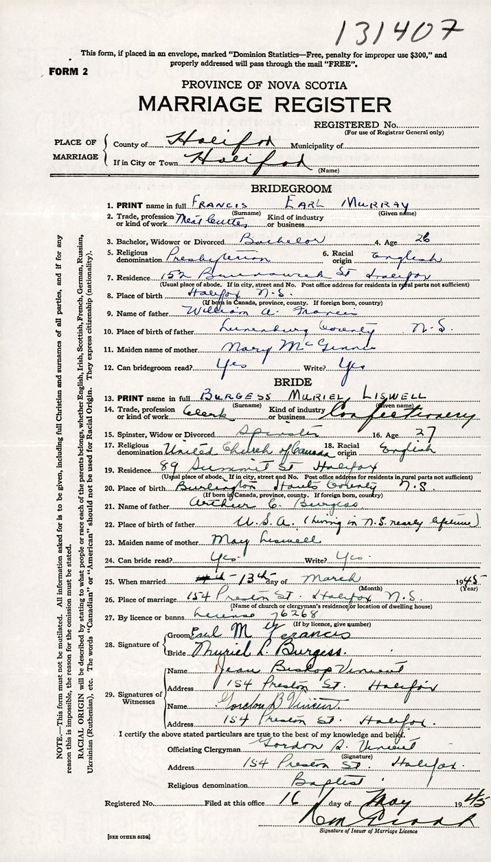 26. Place of marriage 154 Preston Street Halifax, Halifax County
