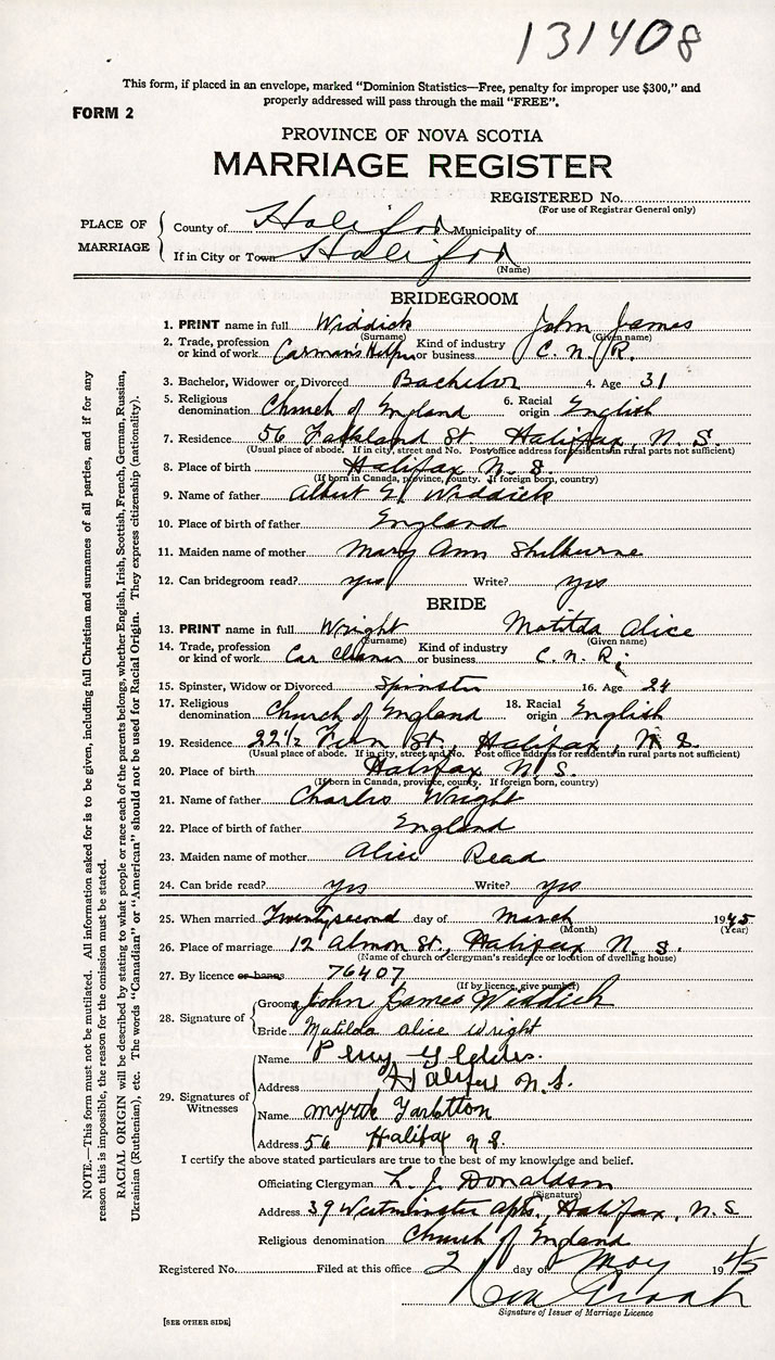 26. Place of marriage 12 Almon Street Halifax, Halifax County
