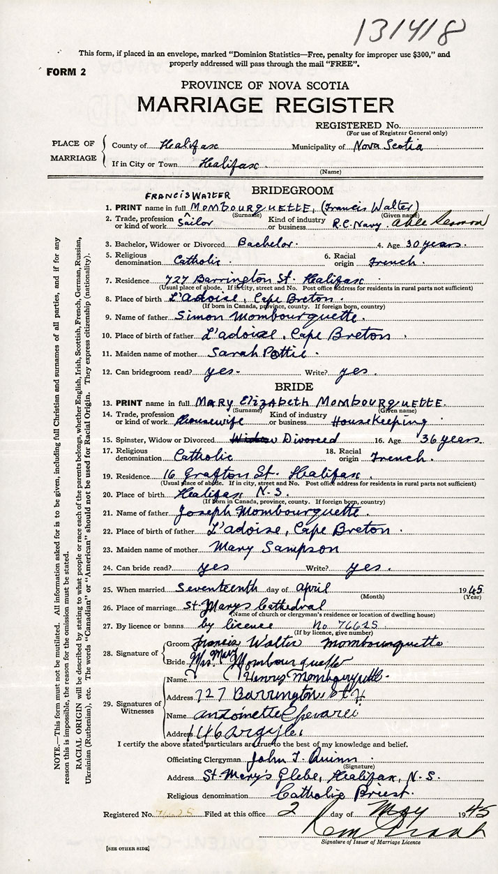 26. Place of marriage St. Mary's Cathedral Halifax, Halifax County