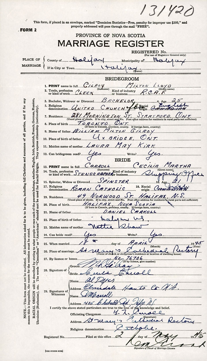 26. Place of marriage St Mary's Cathedral Rectory Halifax, Halifax County