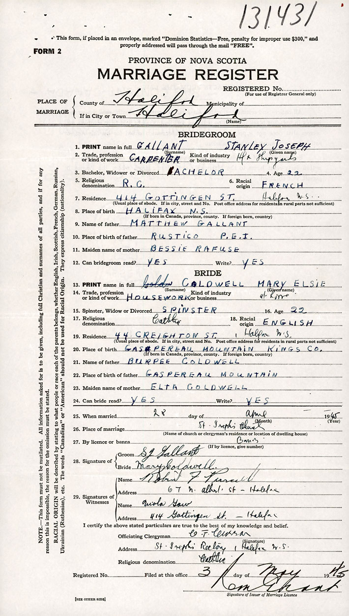 26. Place of marriage St. Joseph's Church Halifax, Halifax County