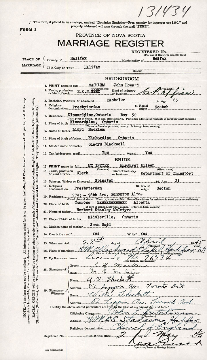 26. Place of marriage H.M.C. Dockyard Chapel Halifax, Halifax County