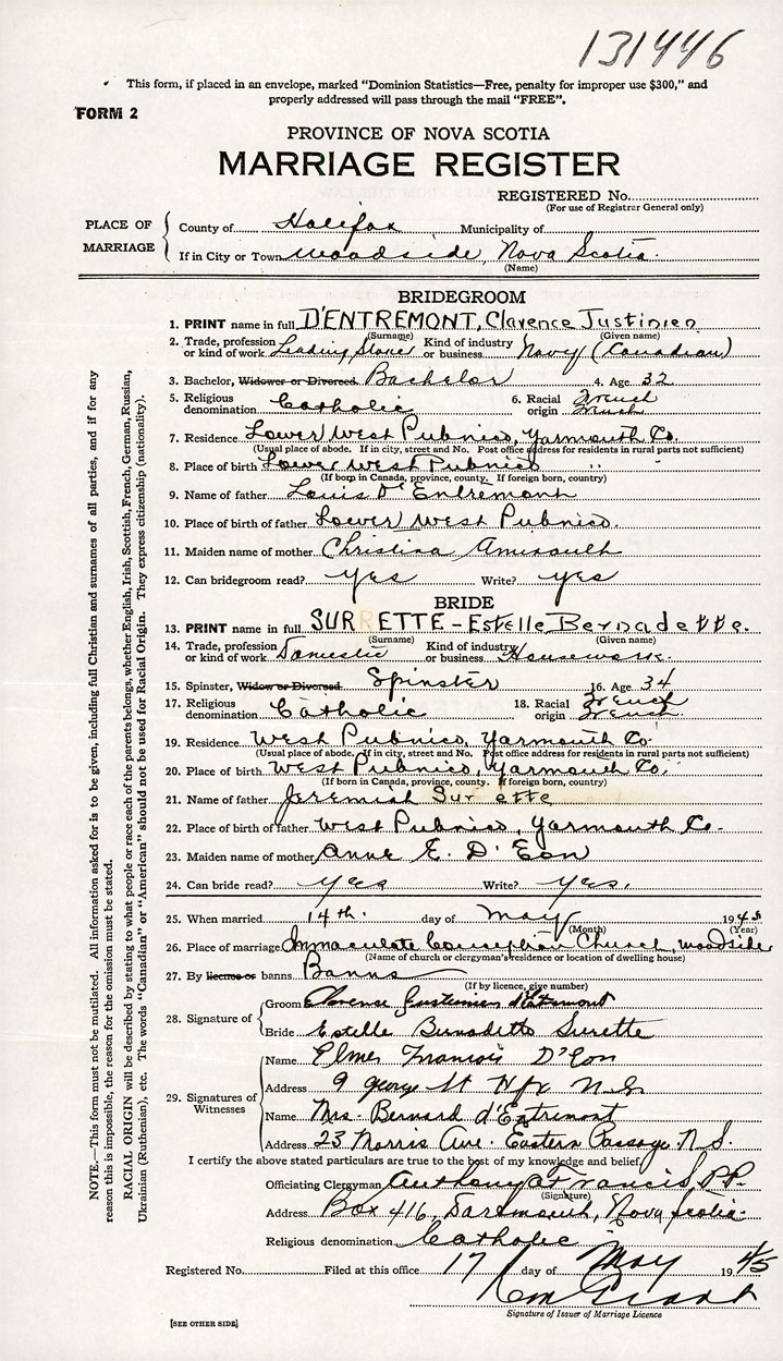 1. PRINT name in full D'Entremont, Clarence Justinien