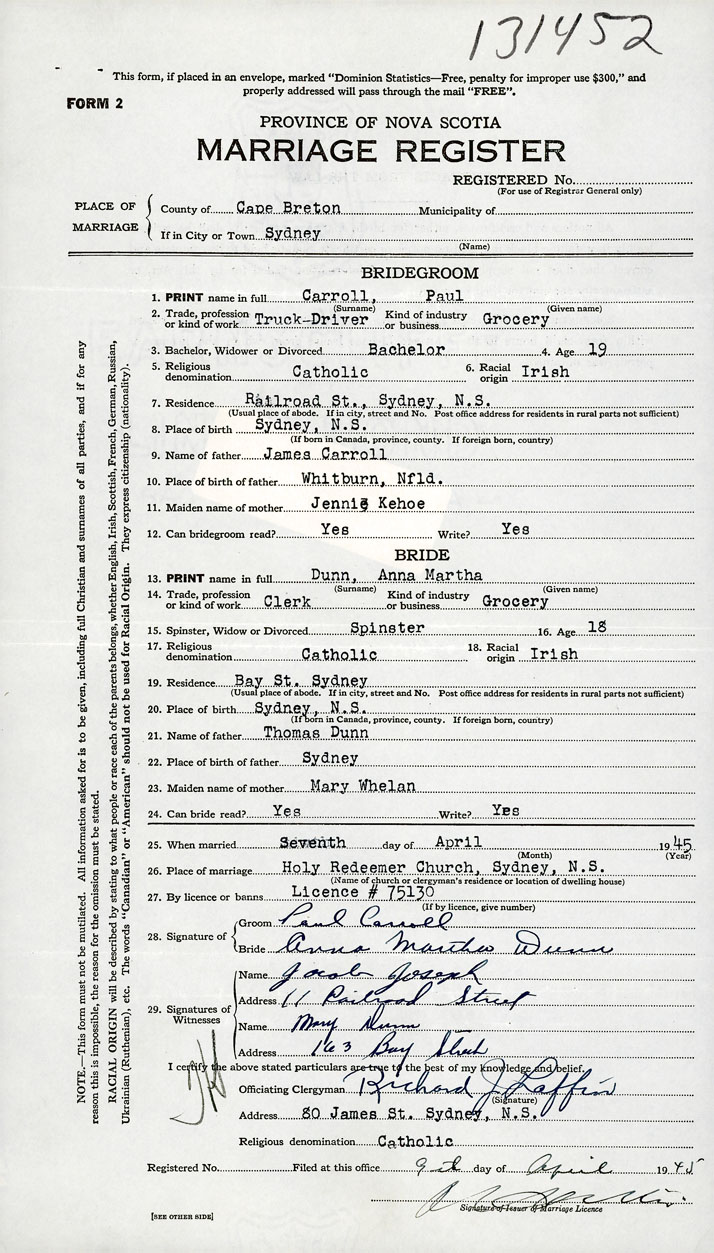 26. Place of marriage Holy Redeemer Church Sydney, Cape Breton County